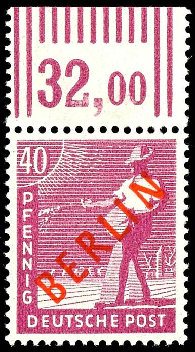 50 pfennigs red overprint, upper margin of plate pressure piece not perforated throughout, mint never hinged, very fine, expertized Schlegel BPP, Michel 400.- (30PORndgz) 50 Pfennig Rotaufdruck, Plattendruckoberrandstück ndgz., postfrisch, tadellose Erhaltung, geprüft Schlegel BPP, Mi. 400.-