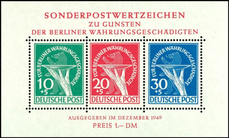 souvenir sheet issue "for Berlin monetary reform vitims", perfect mint never hinged. expertized Schlegel BPP. Michel 950.- (Bl.1) Blockausgabe "Für Berliner Währungsgeschädigte", einwandfrei postfrisch. Geprüft Schlegel BPP. Mi.950.-