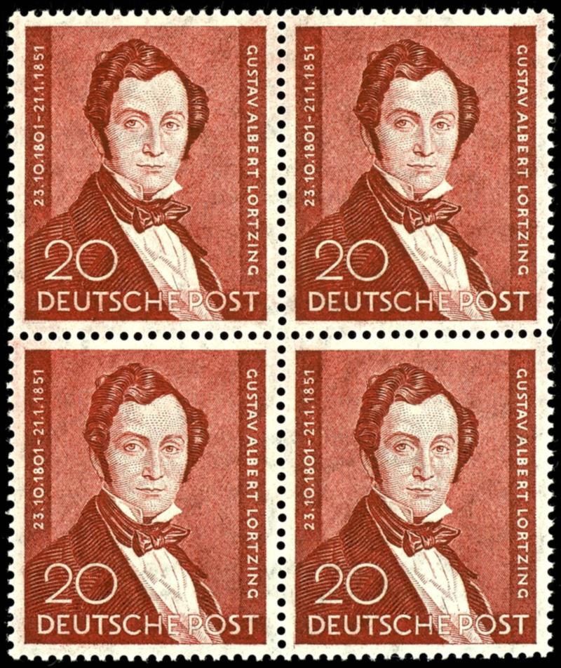 20 pfennigs "100. day of death from Albert Lortzing" in the block of four, unfolded, perfectly mint never hinged, Michel 240.- (74(4)) 20 Pfennig "100. Todestag von Albert Lortzing" im Viererblock, ungefaltet, tadellos postfrisch, Mi.240.-