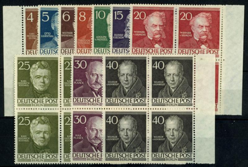 4 pfennigs to 40 pfennigs "men from the history Berlin", set in blocks of four with 10 values, mint never hinged, very fine, unsigned, Michel 520.- (91/100(4)) 4 Pfennig bis 40 Pfennig "Männer aus der Geschichte Berlins", Viererblocksatz mit 10 Werten, postfrisch, tadellose Erhaltung, unsigniert,