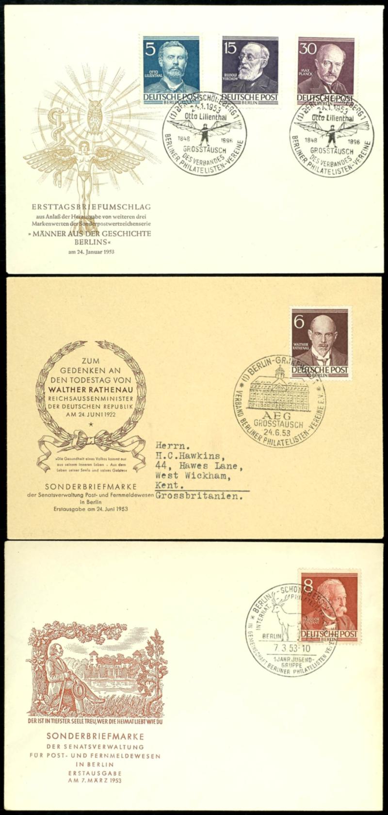 1952, men the history. officially First Day Cover number 92, 96, 99 (1 document), number 93 (1 document) and number 94 (1 document), number 97 (1 document), number 98 (1 document) and number 100 (1 document) . Michel 324.- (91/100) 1952, Männer der Geschichte. Amtliche FDC Nr.92,96,99 (1 Beleg),