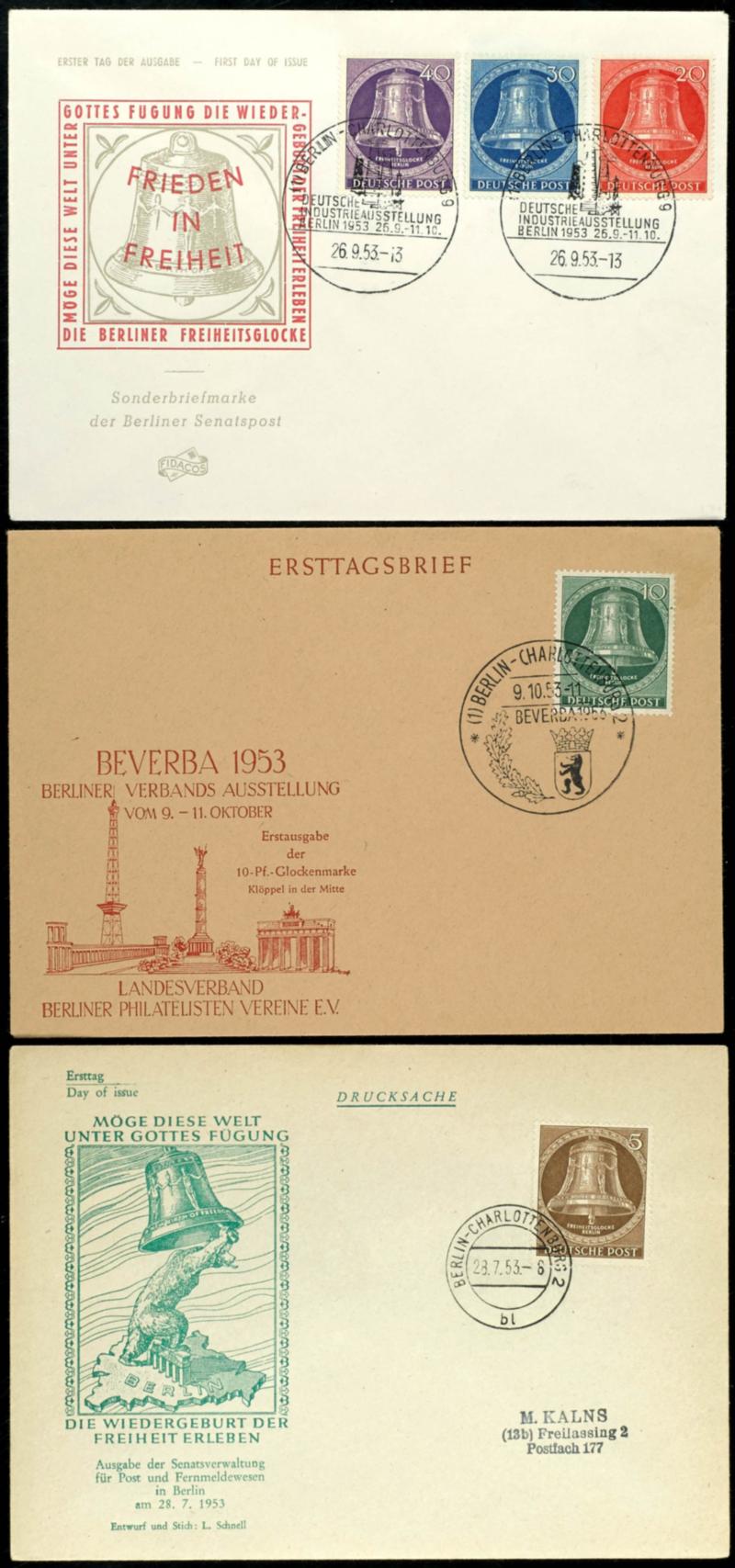5 pfennigs - 40 pfennigs bell middle, five values complete, on 3 decorative blank First Day Cover with corresponding first day postmarks "BERLIN CHARLOTTENBURG", very fine, rare, Michel 540.- (101/05) 5 Pfennig - 40 Pfennig Glocke Mitte, fünf Werte komplett, auf 3 Blanko-Schmuck-FDC mit entsprech