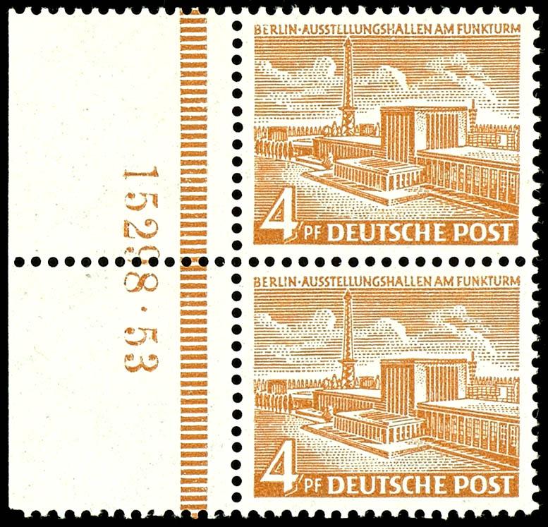 4 pfennigs Berlin buildings (II), vertical pair from margin of sheet with house order number 15298.53, mint never hinged, very fine, Michel 110.- (112HAN) 4 Pfennig Berliner Bauten (II), senkrechtes Paar vom Bogenrand mit Hausauftragsnummer 15298.53, postfrisch, tadellose Erhaltung, Mi. 110.-