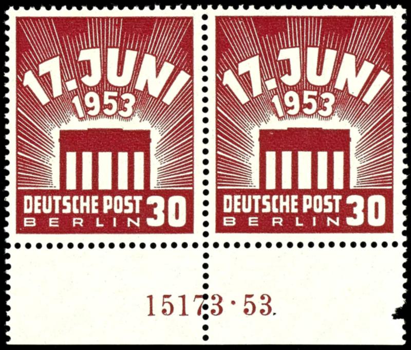 30 pfennigs 17 June 1953, horizontal lower margin pair with house order number 15173.53, mint never hinged, very fine, Michel 180.- (117HAN) 30 Pfennig 17 Juni 1953, waagerechtes Unterrandpaar mit Hausauftragsnummer 15173.53, postfrisch, tadellose Erhaltung, Mi. 180.-