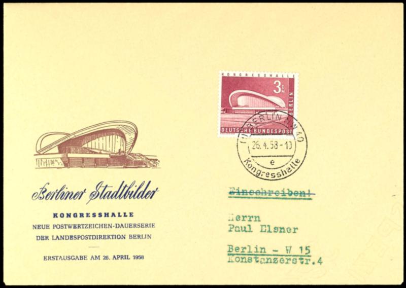 1954, 3 Mark buildings on official First Day Cover from 26.4.58. Michel 600.- (154) 1954, 3 Mark Bauten auf amtlichem Ersttagsbrief vom 26.4.58. Mi. 600.-