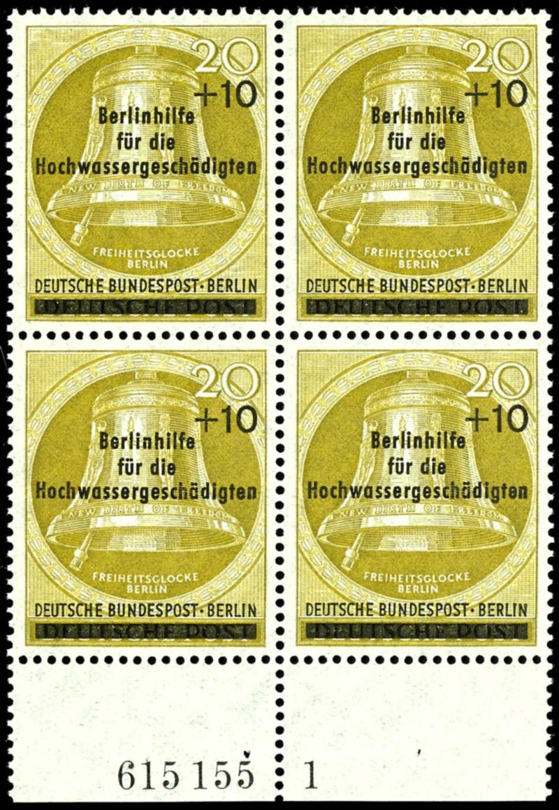10 pfennigs and 30 pfennigs "reconstruction the Berlin philharmonic", set in blocks of four with both values each from lower margin of sheet, mint never hinged, very fine, Michel 560.- plus (72/73(4)) 10 Pfennig und 30 Pfennig "Wiederaufbau der Berliner Philharmonie", Viererblocksatz mit beiden W
