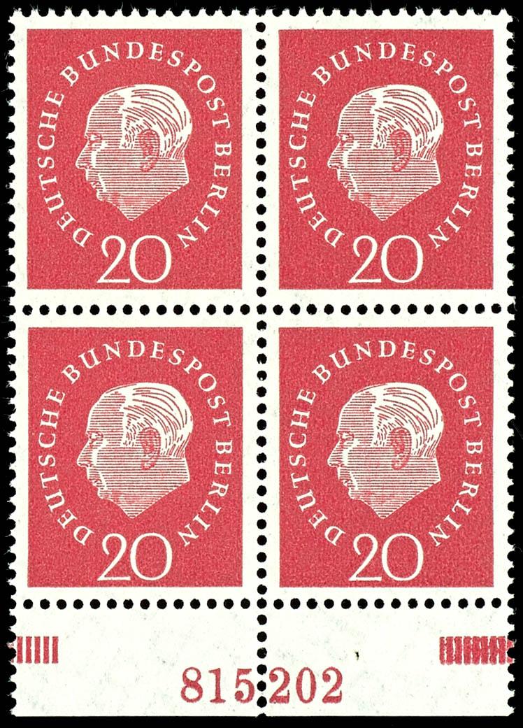 20 pfennigs Heuss medallion, block of four from lower margin with house order number 815202, rippled gum, mint never hinged, very fine, Michel 94.- (184vHAN) 20 Pfennig Heuss Medaillon, Viererblock vom Unterrand mit Hausauftragsnummer 815202, geriffelte Gummierung, postfrisch, tadellose Erhaltung