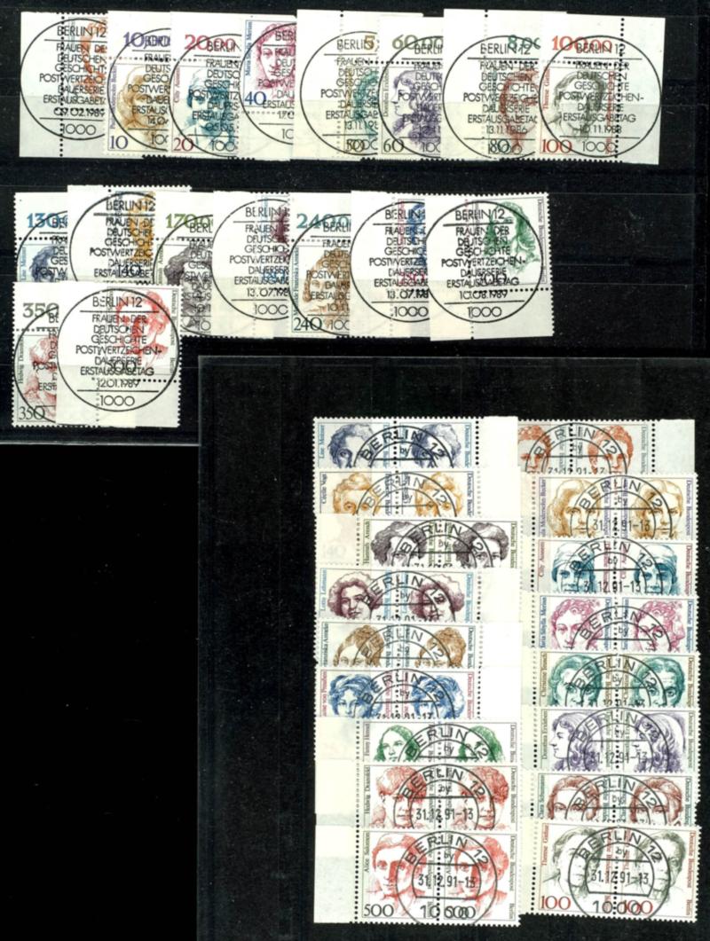 5 Pfg to 500 Pfg "woman of German history", horizontal pair set, complete set with all 17 values, neat cancelled "BERLIN 12 31.12.91". in addition to that complete set with special cancel in the corner margin. (770/849) 5 Pfg bis 500 Pfg "Frauen der deutschen Geschichte", waagerechter Paarsatz, k
