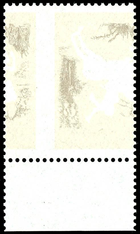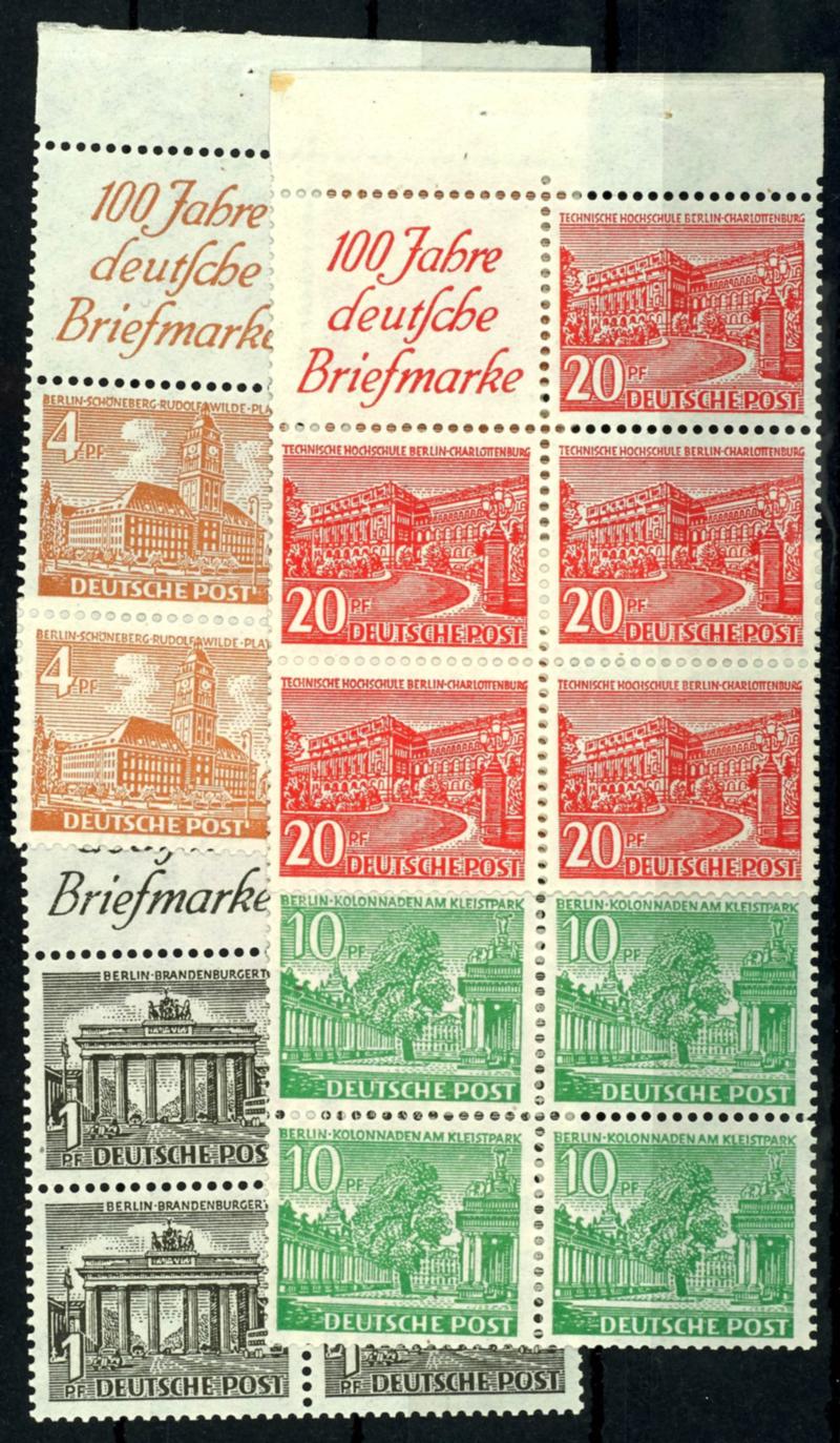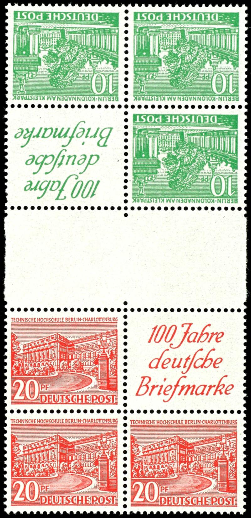 1949, Berlin buildings: 10 pfennigs plus gutter plus "a hundred years German postage stamp" plus 20 pfennigs as well 20 pfennigs plus "a hundred years German postage stamp" plus gutter plus 10 pfennigs, two vertical tete-beche printing together in a unit, mint never hinged, very fine, Michel 900.- p