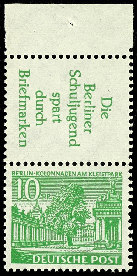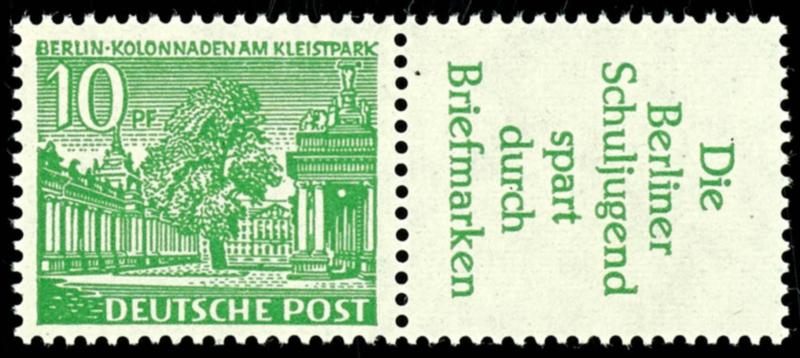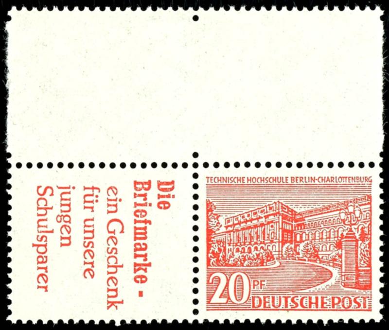 1952, Berlin buildings: "the Berlin Training youth saves through postage stamps" plus 10 pfennigs, vertical se-tenant, mint never hinged, very fine, unsigned, Michel 90.- (S6) 1952, Berliner Bauten: "Die Berliner Schuljugend spart durch Briefmarken" + 10 Pfennig, senkrechter Zusammendruck, postfr