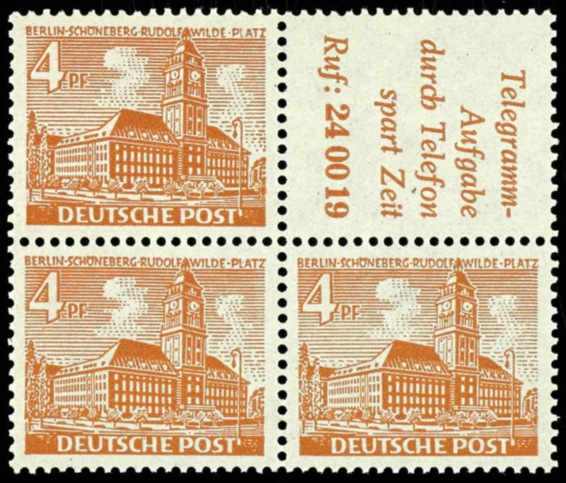 1952, Berlin buildings: 4 pfennigs plus "telegram posting through telephone saves time call: 24 00 19", horizontal se-tenant, mint never hinged, very fine, unsigned, Michel 90.- (W29) 1952, Berliner Bauten: 4 Pfennig + "Telegramm-Aufgabe durch Telefon spart Zeit Ruf: 24 00 19", waagerechter Zusam