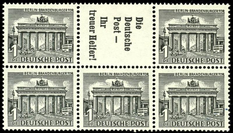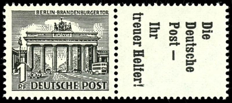 1952, Berlin buildings: 1 pfennigs plus "the German post - Your faithful helper! ", mint never hinged, very fine, unsigned, Michel 45.- (W37) 1952, Berliner Bauten: 1 Pfennig + "Die Deutsche Post - ihr treuer Helfer!", postfrisch, tadellose Erhaltung, unsigniert, Mi. 45.-