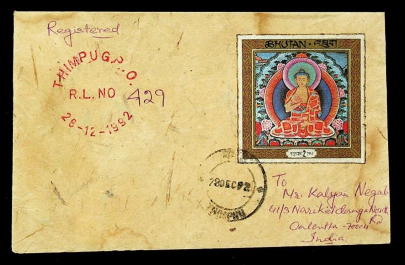 Bhutan 1992 Buddha Silk 2nu on Regd cover w/ USA NY World's Fair 2v Imperf MS+ Panda 2v franked at back to Calcutta India - Rare