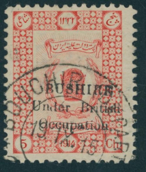 Bushire. 1915 (11 Sept.) 5ch. vermilion, (setting 2, type 3), cancelled by neat 'bouchir (depart)' c.d.s. in black; superb and very rare. Holcombe Certificate (1991). S.G. 18, £20,000