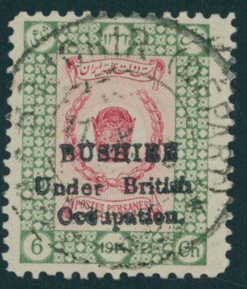 Bushire. 1915 (11 Sept.). 6ch. carmine and green, cancelled 'bouchir (depart) 11 x 15' c.d.s., fine and very rare, just twenty nine stamps were overprinted and issued. Scheller Certificate (2024). S.G. 19, £14,000