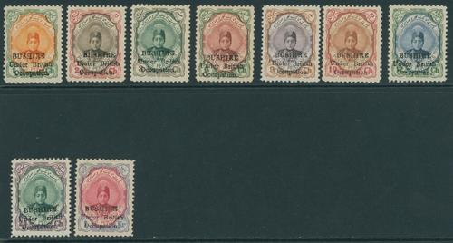 Bushire. 1915 Mint selection, including 1915 (Aug.) values to 1kr. (less 5ch.), 5kr. (setting IIA, position 6) with B.P.A. Certificate (2021), plus 1915 (Sept.) 5kr. (setting II, position 2) with Mehrdad Sadri Certificate (2015). Scarce and fine. S.G. 1-10, 13, 27, £4,575. Photo.