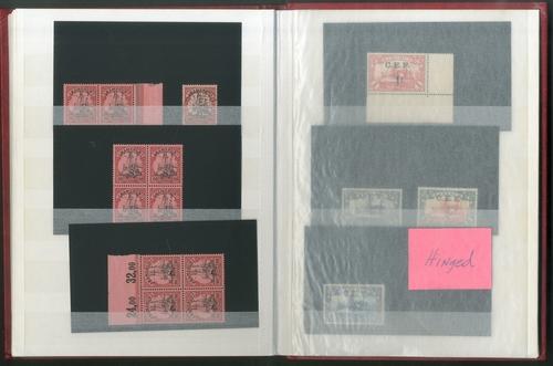 Cameroon. 1915 Cameroon Expeditionary Force mint range in small stockbook, values to 5s. on 5m., including blocks, marginals with selvedge, ½d. on 3pf, variety "different fount 'd'", a few used examples noting 3d. on 30pf. used on the first day of issue (12 July). A good lot for the specialist. Phot