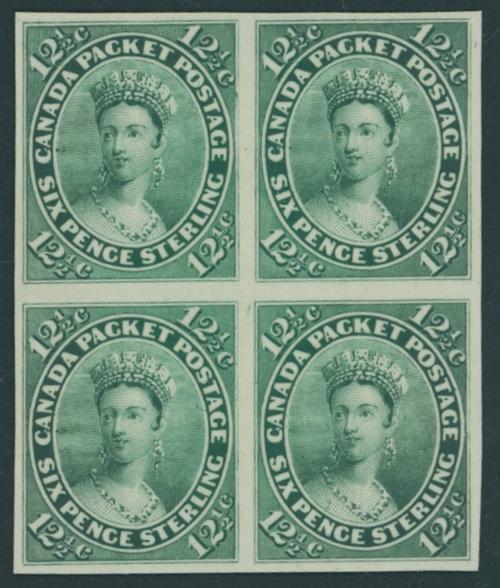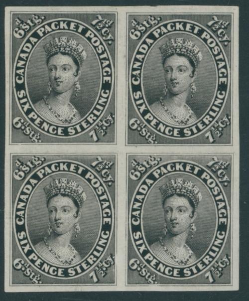 Canada. 1857 7½d. imperforate plate proof in black on India paper, a block of four with large even margins, without gum as produced; fine and a rare multiple. Unitrade 9TC.