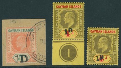 Cayman Islands. 1907 provisional surcharges trio, comprising 1907 1d. on 5/- salmon, fine used, tied to piece, 1d. on 4d. prepared for use but not issued, plus a forgery. See S.G. footnote. Photo.