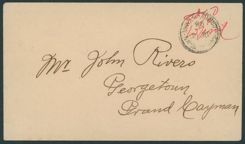 Cayman Islands. 1908 manuscript provisional cover, endorsed "Pd 1/4d/W.G. McC" in red, overstamped by Grand Cayman c.d.s., without flap, otherwise fine, S.G. MP2, £250. Photo.