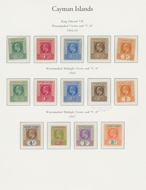 Cayman Islands. 1902-35 mint collection on album leaves, including 1902-3 set, 1905 set less 6d., 1907 set less 6d., 1907 ½d. on 1d., 1907-9 set, 1912-20 set, 1921-22 values 10/-, 1921-26 set, 1935 pictorials set. Generally fine.