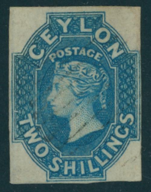 Ceylon. 1857-59 2/- dull blue, four margins, just touching at right, very fine, S.G. 12, £1,400. Photo.