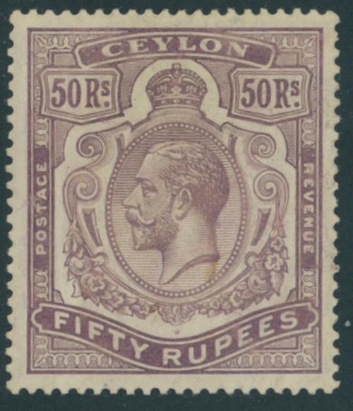 Ceylon. 1912-25 Watermark Multiple Crown CA. 50r. dull purple, large part original gum, very fine, American Philatelic Society Certificate (2003), S.G. 320, £750. Photo.