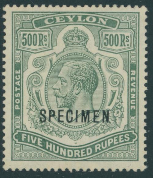 Ceylon. 1912-25 Watermark Multiple Crown CA. 500r. dull green, overprinted "specimen", large part original gum, fine, S.G. 322s, £800. Photo.