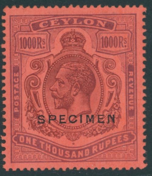 Ceylon. 1912-25 Watermark Multiple Crown CA. 1000r. purple/red, overprinted "specimen", large part original gum, fine, S.G. 323s, £2,000. Photo.