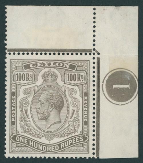 Ceylon. 1921-32 Watermark Multiple Script CA. 100r. brownish grey, corner marginal from the top-right of the sheet, with plate number "1", fine mint, mounted on the margin only, variety "break in scroll". B.P.A. Certificate (2022), S.G.359a, £6,000.