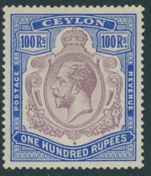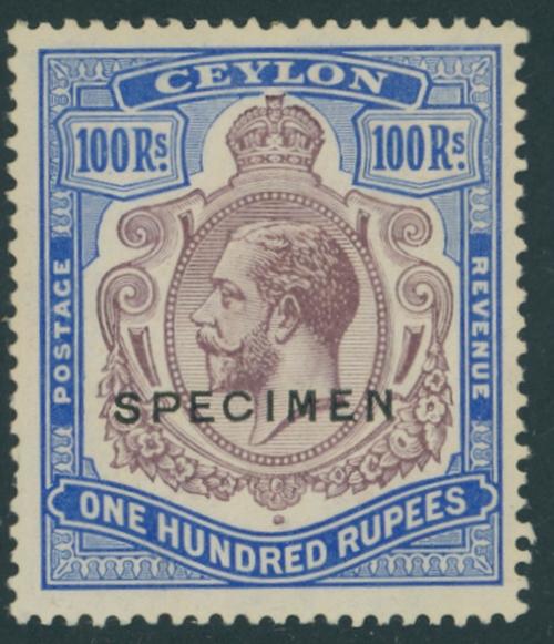 Ceylon. 1921-32 Watermark Multiple Script CA. 100r. dull purple and blue, overprinted "specimen", large part original gum, very fine, S.G. 360s, £550.