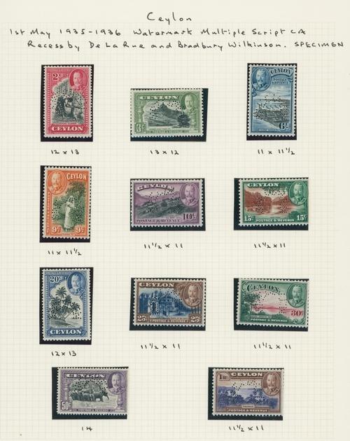 Ceylon. 1899-1948 mint collection on album leaves, comprising 1899-1900 set overprinted "specimen", 1903-5 specimen set, 1910-11 specimen set, 1935-36 set perforated "specimen", 1938-49 specimen set, also set mint. Chiefly fine.