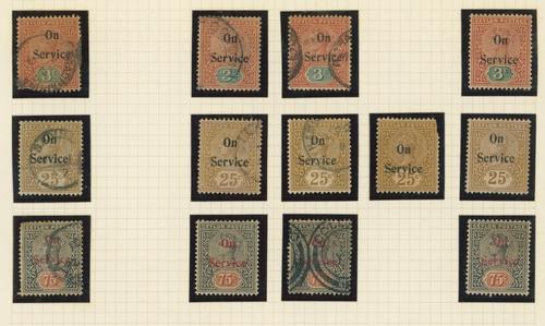 Ceylon. 1886-1900 mint and used collection on album leaves, with duplication, noting Postal Commission surcharges both colours with "ceuts" errors and the rosy mauve with italic surcharge toned gum. Some varieties, including S.G. 210b used, 211b used, 233i mint (toned gum, heavy hinge) and used, use