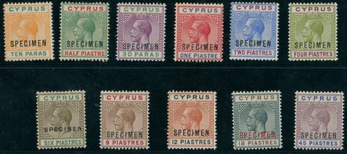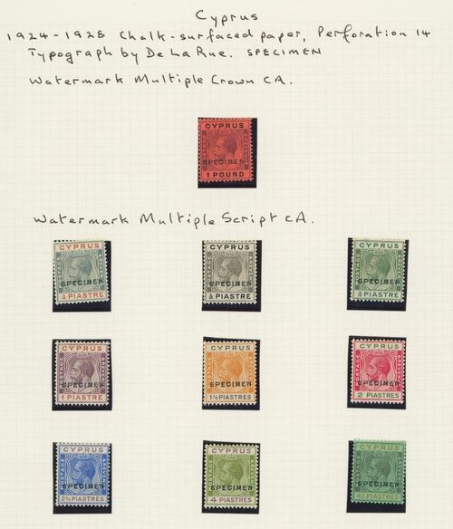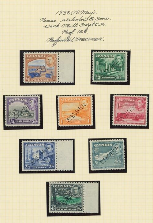 Cyprus. A range of overprinted or perforated "specimen", including 1894-96 set, 1902-4 set (less ½pi), 1912-15 and 1921-23 values to 45pi., 1921-23 10/- and £1, 1924-28 values to 90pi., £1, 1938-51 values to 90pi., 1937 Coronation set, 1946 Victory set, with gum, slightly varied condition.