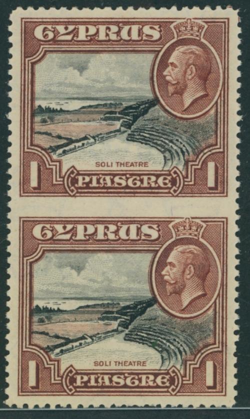 Cyprus. 1934 1pi. black and red-brown vertical pair, variety "imperforate between", mint with hinge remnants at top, and guide marks at top-right. A few shortish perforations, otherwise very fine. Rare. B.P.A. Certificate (1999), S.G. 136a, £25,000. Photo.