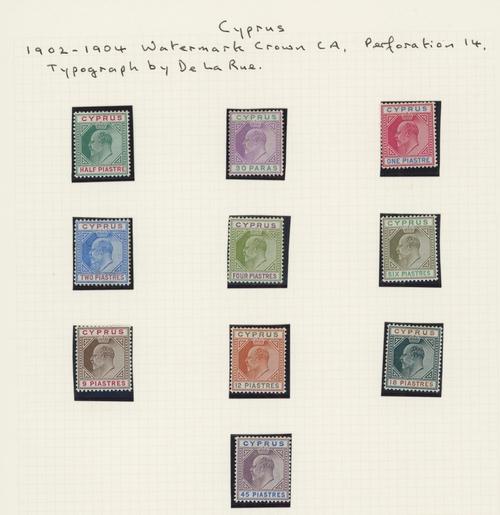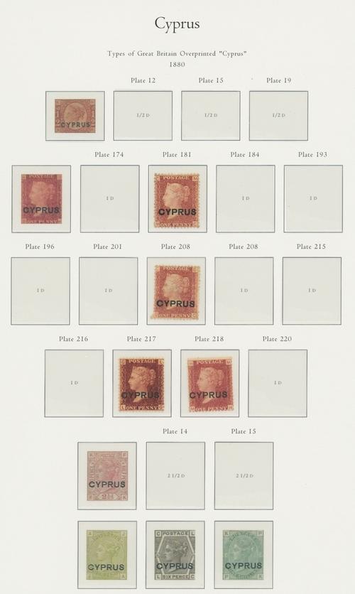 Cyprus. 1880-1935 mint collection on album leaves, including 1880 "cyprus" overprinted plates 181, 208, 217, 218; 1881 plates 174, 181, 205, 201; 1881 ½pi. with Richter cert (1995), 1892-94 values to 12pi., 1904-10 values to 45pi., 1912-15 set, 1912-23 set to 10/-, 1928 set, 1934 set. Condition in t