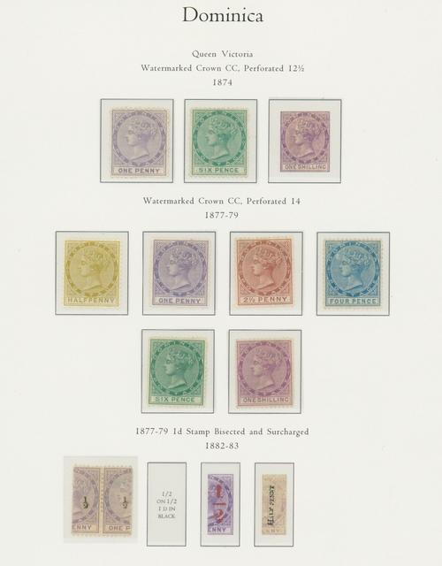 Dominica. 1874-1935 mint collection on album leaves, including 1874 1d. and 6d., 1877-79 set, 1886-90 set, 1903-7 set (some light toning in places), 1907-8 values to 5/-, 1908-21 values to 5/-, 1921-22 set, 1923-33 set. Condition in the earlier issues somewhat mixed, the latter period generally good