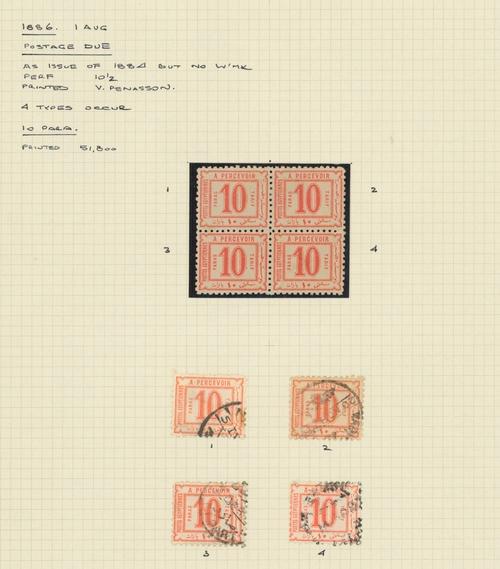 Egypt. 1886 postage dues specialised collection on album leaves, including 10pa. block of four unused, imperforate strip of three, 20pa. (all four types) unused, type IV with Haas cert, one used in Sawakin, 1pi. unused block of twelve, mint and used singles (7), 2pi. block of four unused, plus range