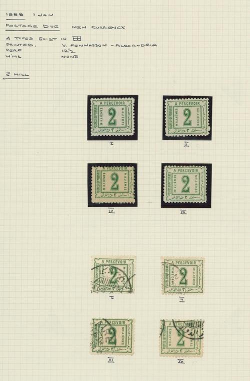 Egypt. 1888 postage dues specialised collection on album leaves, including four types of each value mint and used, early usage (31 Jan) fragment bearing 2m. two strips of four, 5m. with scarce guide lines, 5m. imperforate single, 1pi. imperforate proof pair and single, block of four unused, 2pi. imp