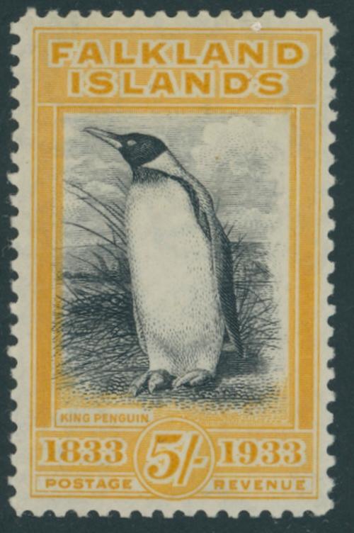Falkland Islands. 1933 Centenary of British Administration 5/- black and yellow, original gum, small hinge remainder, otherwise fine, S.G. 136, £1,000. Photo.