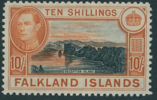 Falkland Islands. 1938-50 10/- black and deep reddish orange (thin paper), very fine mint, S.G.162c, £1,000. Photo.