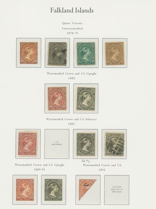 Falkland Islands. 1878-1935 mostly mint collection on album leaves, including 1878-9 no watermark 4d. cancelled early 4x2 cork (Ob.2/78), 6d. and 1/- unused, 1885 noting 4d., variety "watermark crown to right of CA" unused with heavy hinge remainder, also 4d. cancelled 5x4 cork (Ob.1/84), 1891-2 ran