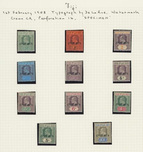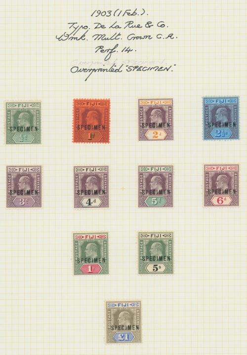 Fiji. A range overprinted or perforated "specimen", comprising 1903 set, 1906-12 values to £1, 1912 values to £1, 1922-27 set, 1938 values to 5/- and 1949 Victory set, slightly mixed condition.
