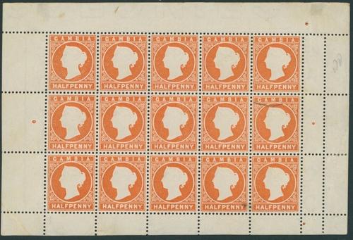 Gambia. 1874-1929 a lovely mint group on Hagners and album pages including 1874 CC 6d. imperforate pair, 1880-81 ½d. orange complete sheet of fifteen, 1/- green used, 1/- deep green mint, 1886-93 ½d., 1d., 2d. and 6d. overprinted "specimen", ½d., green (6, shades), 1d. carmine (4), 4d. brown and 4d.