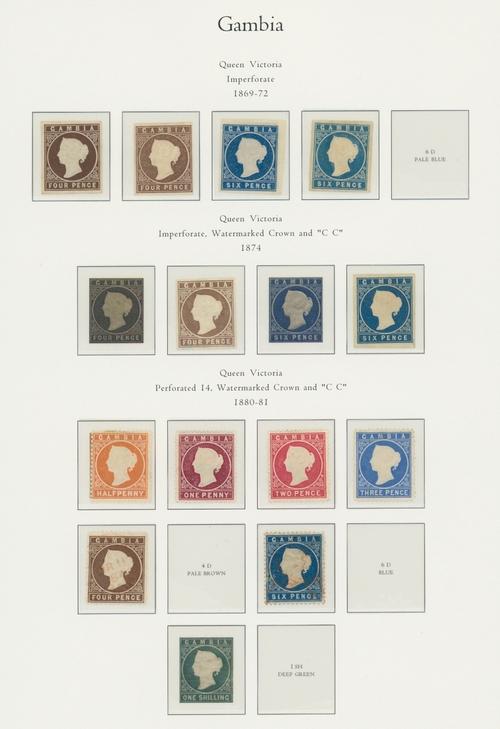 Gambia. 1869-1935 mostly mint collection on album leaves, including 1869-72 4d. (2) and 6d. (2) imperforates, 1874 4d. and 6d. imperforates, the latter possibly used, 1880-81 ½d. to 3d. unused plus 4d. and 6d. used, 1886-93 set noting 6d. shades (one used), 1898 set, 1902-5 set, 1904-6 set, 1906 sur