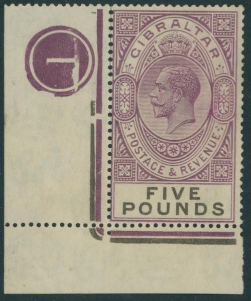 Gibraltar. 1925-32 Script £5 violet and black, a lower-left corner example with plate number 1'; fine unmounted mint. S.G. 108, £1,600