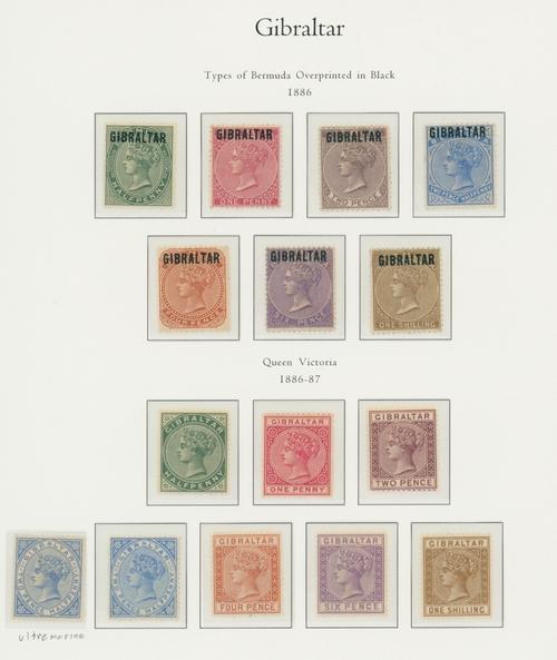 Gibraltar. 1886-1935 mint collection on album leaves, including 1886 set "gibraltar" overprinted on Bermuda, 1886-7 set, 1889 set noting 25c., variety "small 'i'", 1889-95 set with 5c., variety "broken 'm'", 1898 set, 1903 set to 8/ - 1904-8 values to 4/-, 1906-11 2/- and 4/- corner marginals with p