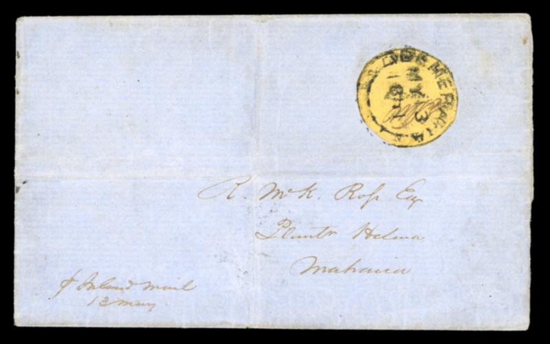 1850-51, 4 cents black on orange, with initials of postal official Wight “EDW”, cut round very fine with very good margins for this stamp, used on cover (one side flap missing)