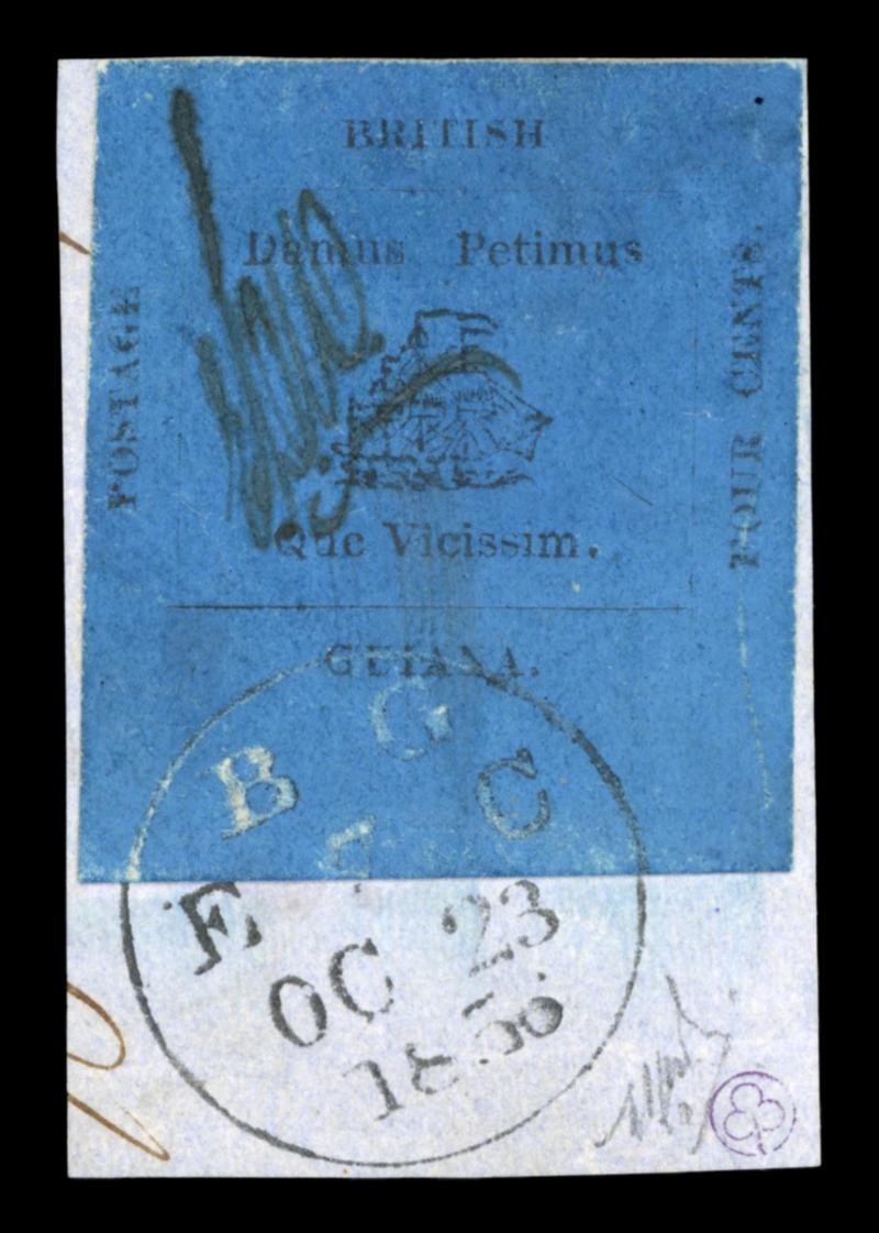 1856 4c black on blue surface coloured paper with manuscript signature "EDW", on piece, tied with "B G/E7C/OC 23/1856" cds. The extremely fine cut square stamp has wide to huge margins and fresh colours.