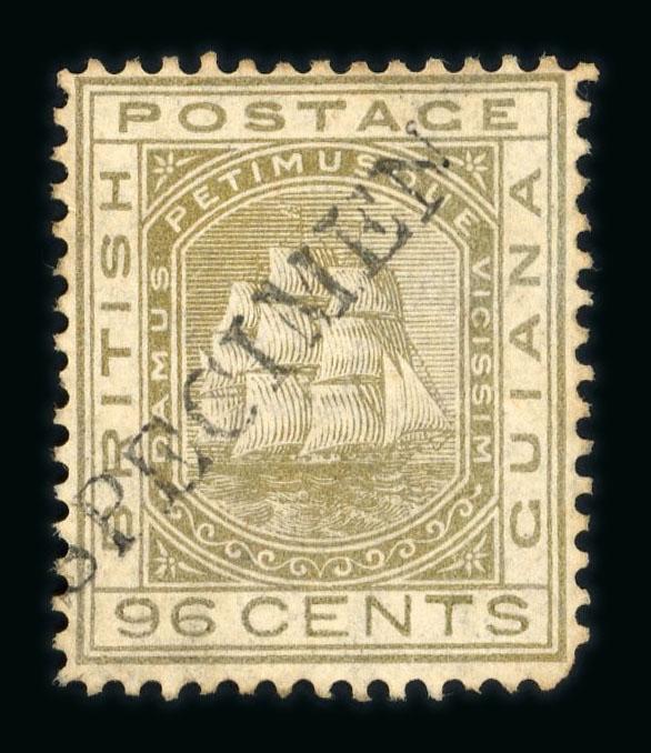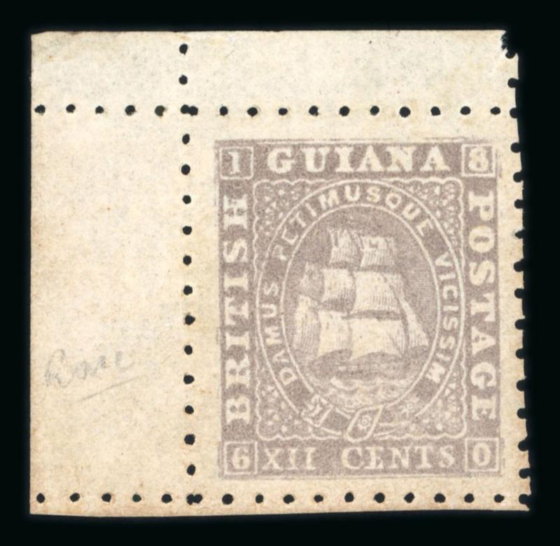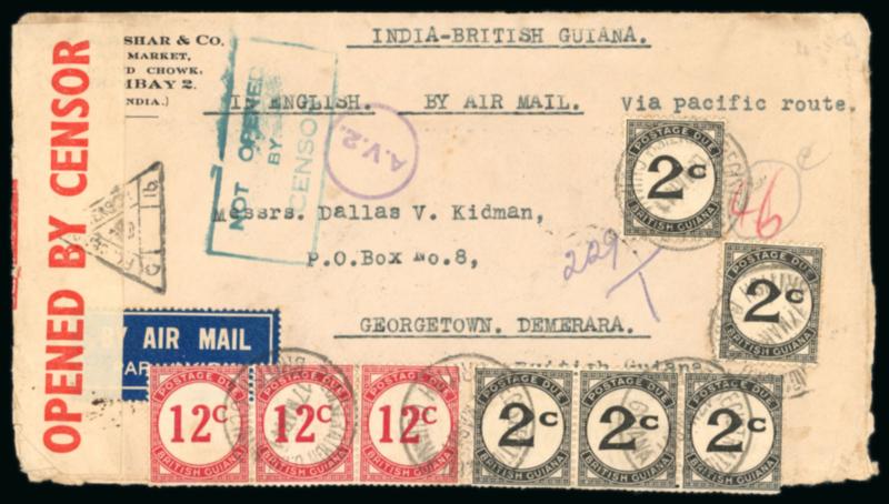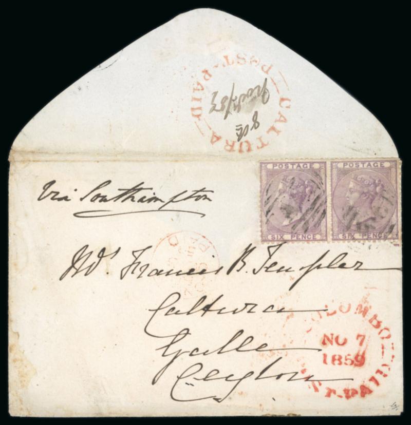 1859 (Sep 9) envelope from Demerara to Ceylon franked with GB 1855-57 6d pair tied by "A03" barred ovals, reverse with Demerara despatch cds, London transit, Colombo transit and Caltura arrival cds, a unique cover from British Guiana to Ceylon; cert. BPA (1993).